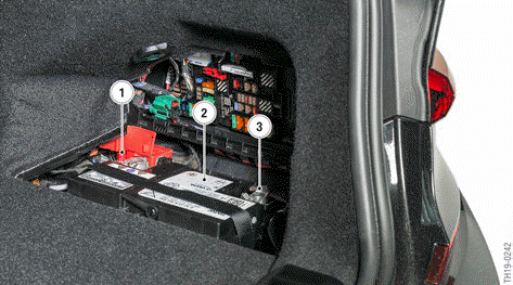 The energy required by the starter motor is provided by the auxiliary battery. It is installed in the luggage compartment. The auxiliary battery is a lead-acid battery with a capacity of 60 Ah.