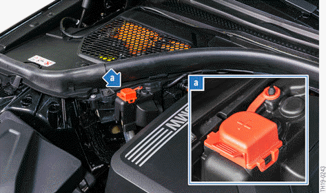 In the event of an accident of sufficient severity, the safety battery terminal (SBK2) ensures the disconnection of the positive battery cable between the auxiliary battery and starter motor. The safety battery terminal (SBK2) is located directly at the positive terminal of the auxiliary battery. The pyrotechnic activation of the safety battery terminal (SBK2) for the auxiliary battery is effected by the Advanced Crash Safety Module (ACSM).